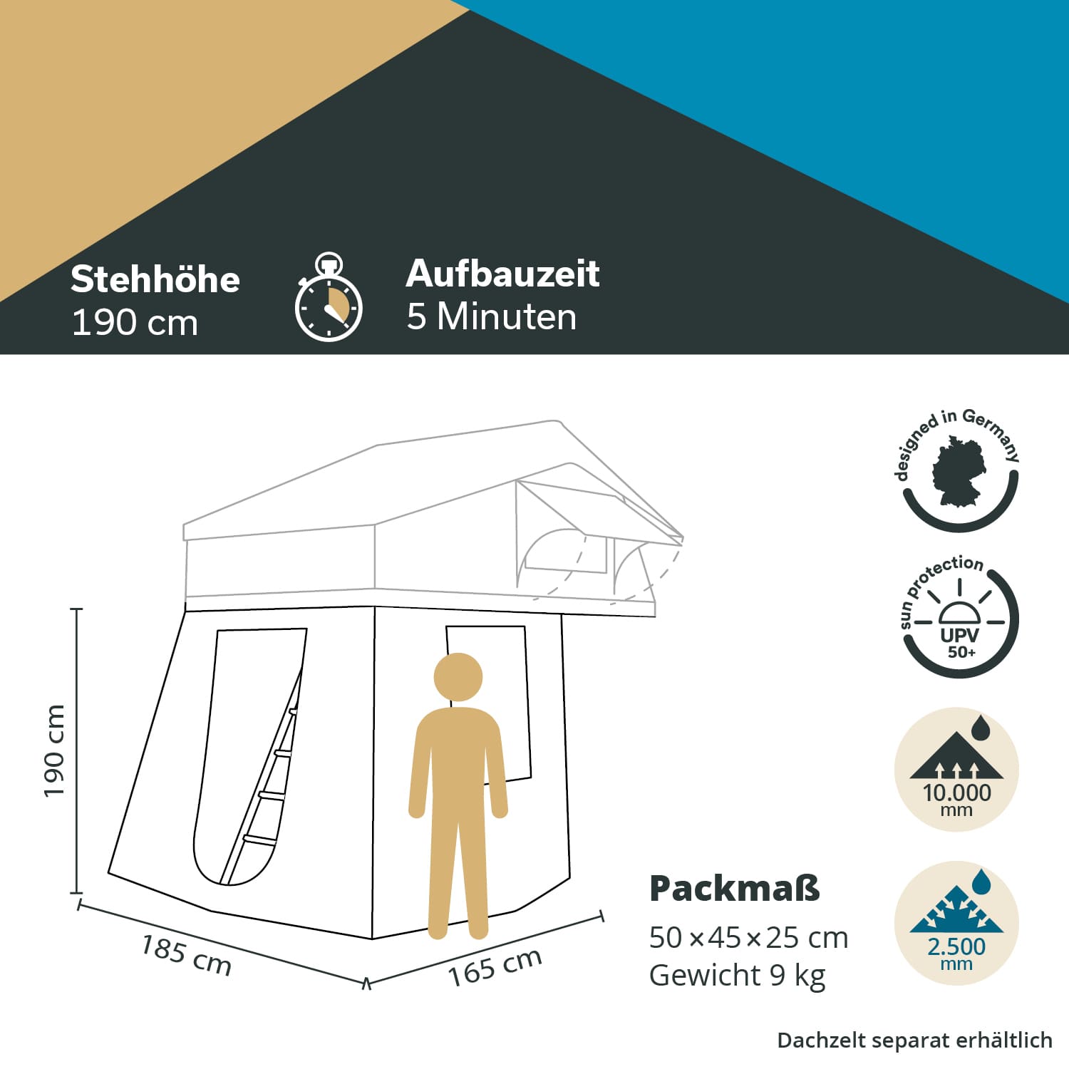 - Perfekter Wetterschutz – Zeltmaterial mit 2.500 mm Wassersäule und UV-Schutz 50+